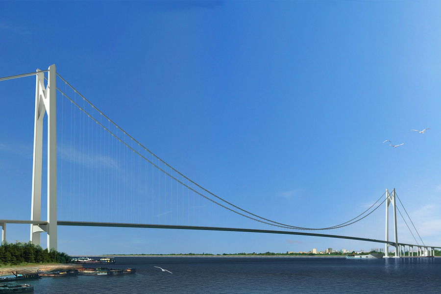 南京仙新路過江通道工程跨江大橋?yàn)閱慰玳T型塔整體鋼箱梁懸索橋,主跨1760m。...