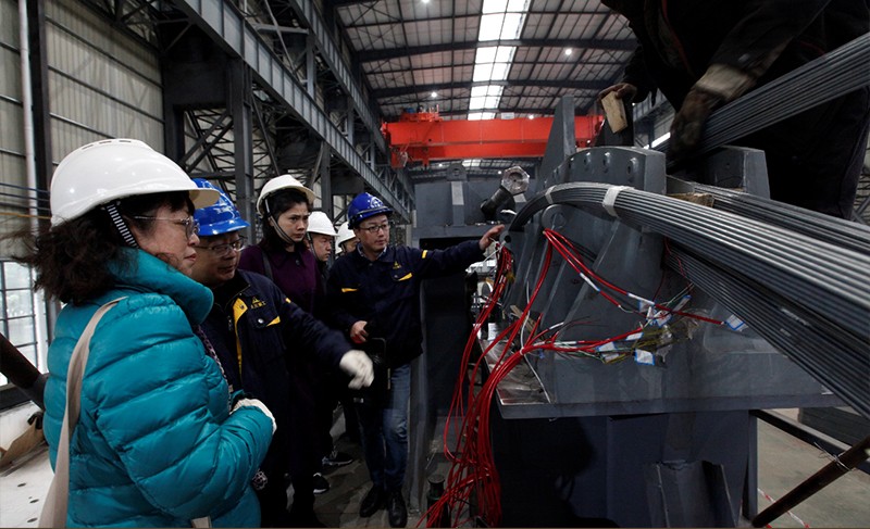 除索鞍索夾制造外,天元公司還承擔(dān)了陽(yáng)寶山特大橋錨固系統(tǒng)研發(fā)及供應(yīng)、AS法的科研課題以及上部結(jié)構(gòu)施工等任務(wù)。驗(yàn)收組領(lǐng)導(dǎo)一行檢查了天元公司科研試驗(yàn)現(xiàn)場(chǎng),并細(xì)致了解科研試驗(yàn)開(kāi)展情況,對(duì)于科研課題的順利開(kāi)展,驗(yàn)收組領(lǐng)導(dǎo)給予了高度的評(píng)價(jià)。